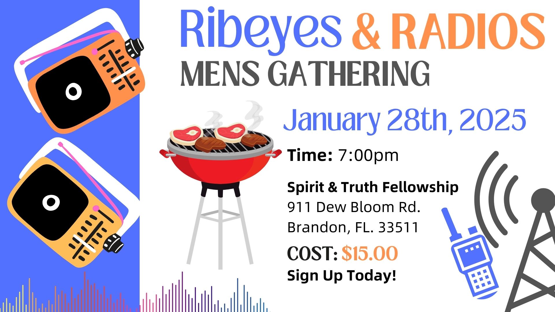 Join us on February 28th for the S&T Men’s Gathering! Come learn about shortwave radios, enjoy some ribeye steaks, and connect with other men at Spirit and Truth Fellowship. We will also be diving into the word together that will encourage and uplift you.